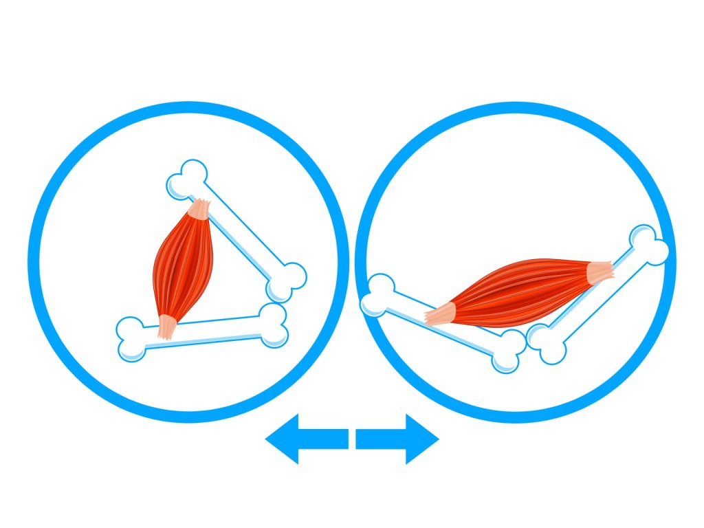 この姿勢が続くと筋肉が過剰に収縮してしまいます。収縮は筋肉が短くなることで力を生み関節を動かすことです。