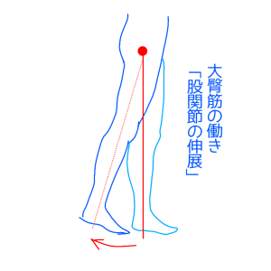 股関節を後ろに上げる筋肉が使えなくなり、歩いている際に地面を蹴る力が弱まり、足を後ろに出すのではなく、体が前に倒れて足を後ろに出そうと代償的に体が前に倒れます。
