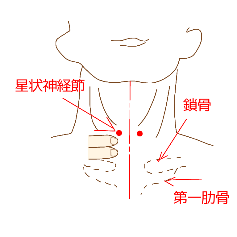 (注)首の前には「星状神経節」といって上半身の血行を司る交感神経が集中した部位があり、これは背骨の左右を頭から腰方向に走行する交感神経とつながる膨らんだ部分(節)ですので、全身のいろいろな臓器に分布する交感神経の働きと関与しています。そこが硬く浮腫んでいると自律神経のバランスが崩れている可能性が高いと言われています。そこで…